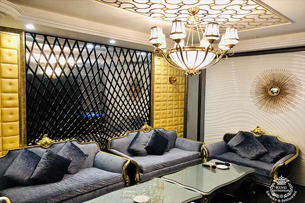 대리석 테이블·고급 소파·은은한 네온 조명이 어우러진 하이엔드 감성 공간입니다.